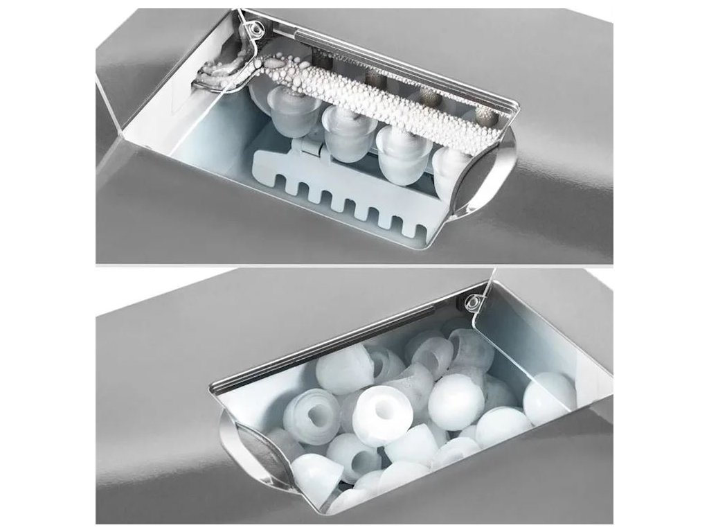 Aparat za led je bez potrebe priključenja na dovod vode – ima vlastiti spremnik vode u koji jednostavno natočite vodu. Kada se spremnik za led napuni ili je razina vode preniska, oglasit će se sigurnosni alarm. Količinu leda možete provjeriti kroz prozirni prozor.