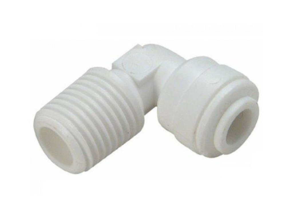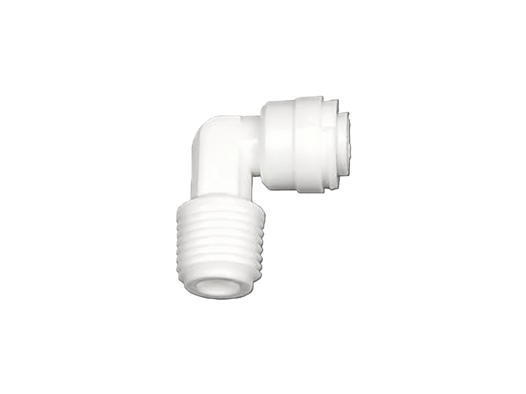 Brza spojka u obliku koljena s vanjskim navojem 1/4\" za priključak na uređaje i ulaz za crijevo o promjeru 1/4\"– 6,35 mm. Namijenjena dozatorima vode i filtracijskim sustavima. Jednostavna montaža bez upotrebe alata.