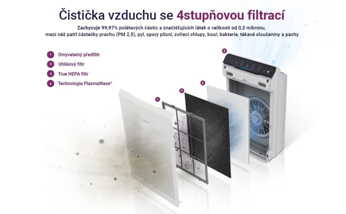 Napredni filtracijski sustav čistača zraka Winix Zero iz zraka uklanja prašinu, pelud, alergene životinja, dim cigareta, viruse, bakterije, spore plijesni, organske kemikalije i mirise. Tehnologija PlasmaWave® stvara pozitivne i negativne jone, zahvaljujući kojima se nečistoće u zraku razgrađuju na molekularnoj razini. Predstavlja idealno rješenje za alergičare i astmatičare.