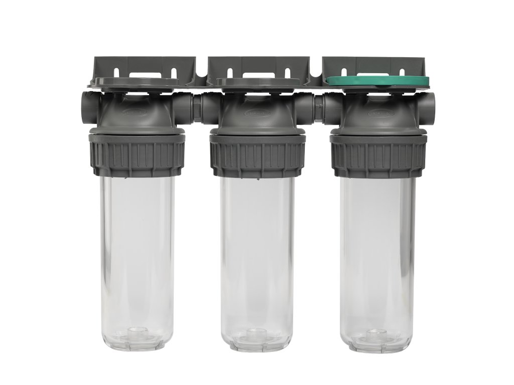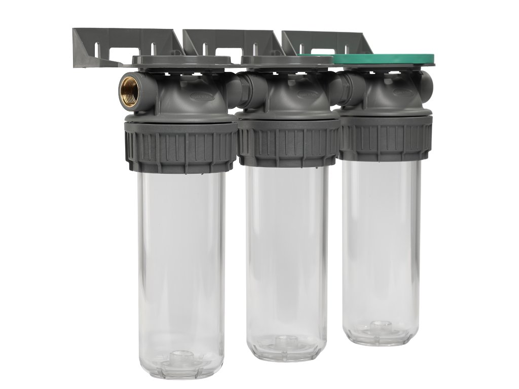 Filtarska oprema PX ECO TRIO je spajanje tri plastične prozirne cijevi za umetanje bilo kojih filtracijskih umetaka veličine 9“ ¾. Odaberite priključak ¾“ ili 1“. Pravilnim odabirom filtracijskih umetaka može se postići optimalna kvaliteta izlazne vode.