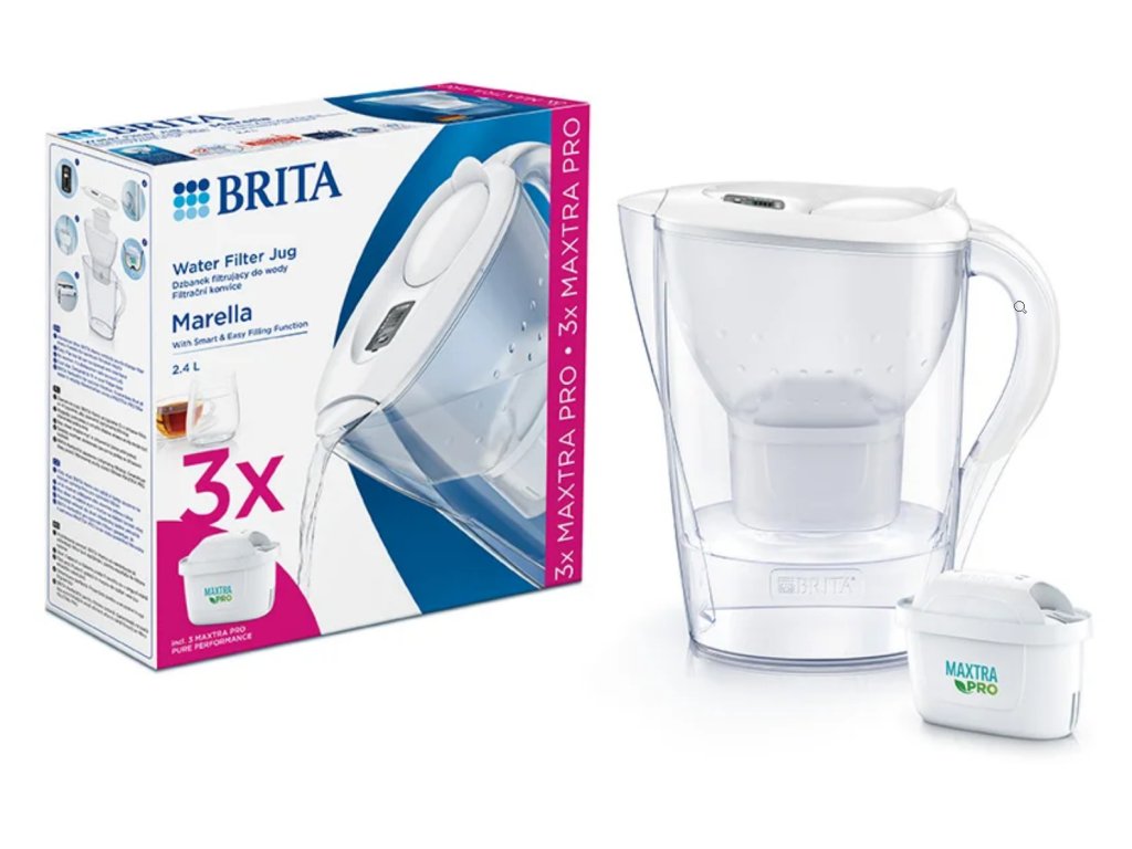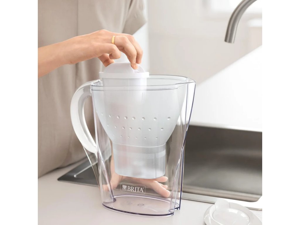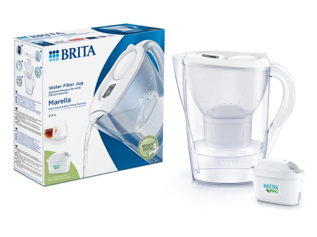 Filtracijska posuda Brita Marella s ukupnim volumenom 2,4 l. Lako se puni zahvaljujući otvorivom poklopcu i opremljena je indikatorom za zamjenu filtra. Dostupna je u bijeloj i plavoj varijanti.