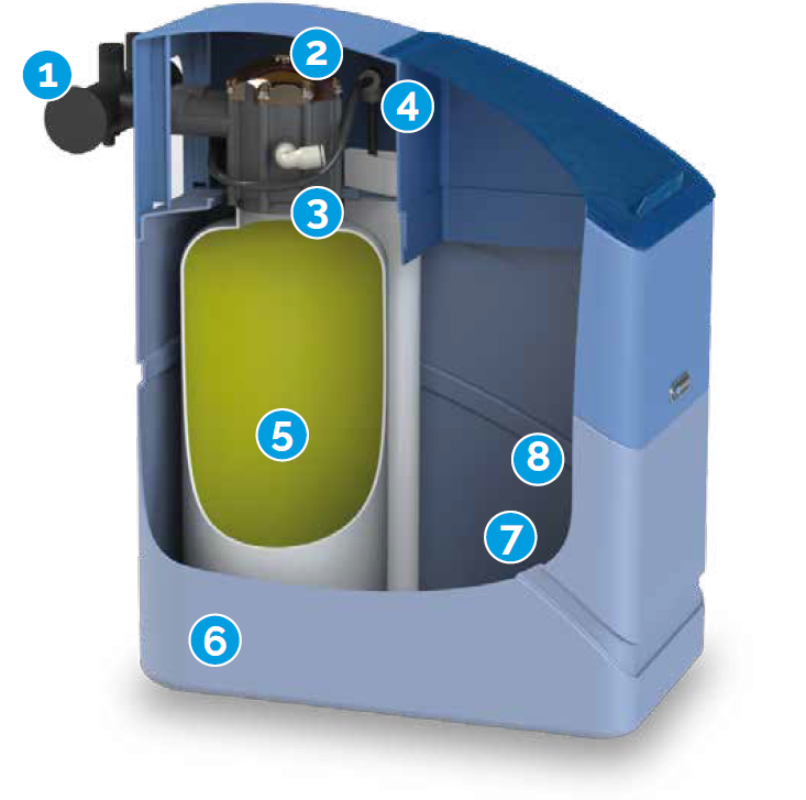 1. SAVING REGEN SYSTEM - Niska potrošnja vode i soli, standardni bypass za preostalu tvrdoću 2. DIRECT ACCESS SYSTEM - jednostavno puštanje u rad 3. SPEED REGEN - vrlo brza regeneracija (15 minuta) 4. Floater za praćenje nivoa slane otopine 5. Visok protok i pri malim dimenzijama 6. Visokokvalitetni kabinet od izdržljive plastike 7. Tablete soli 8. Blok soli |
