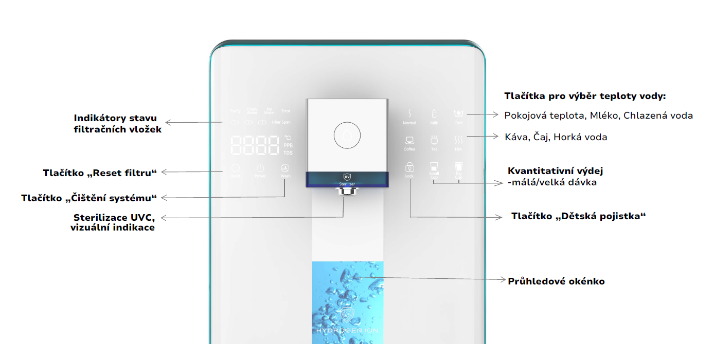 Osim toga, uređaj je opremljen UVC LED sterilizacijskom lampom, koja jamči dodatnu zaštitu od virusa i bakterija. Zahvaljujući preglednom dodirnom upravljačkom panelu s inteligentnim funkcijama rukovanje je jednostavno i intuitivno. Dugme za dječju zaštitu doprinosi sigurnom korištenju uređaja, dok funkcija kvantitativnog doziranja vode osigurava veći korisnički komfor. Integrirani svjetlosni indikator upozorava na potrebu zamjene filtracijskih umetaka.