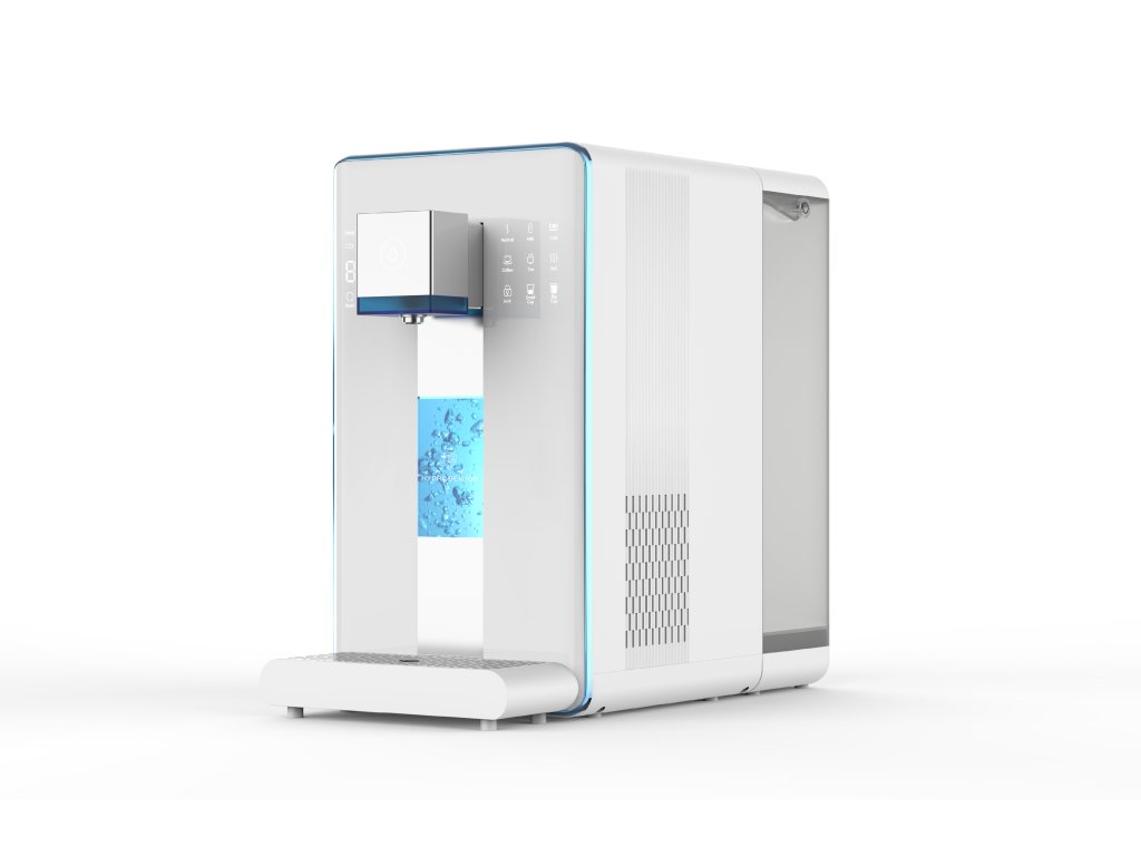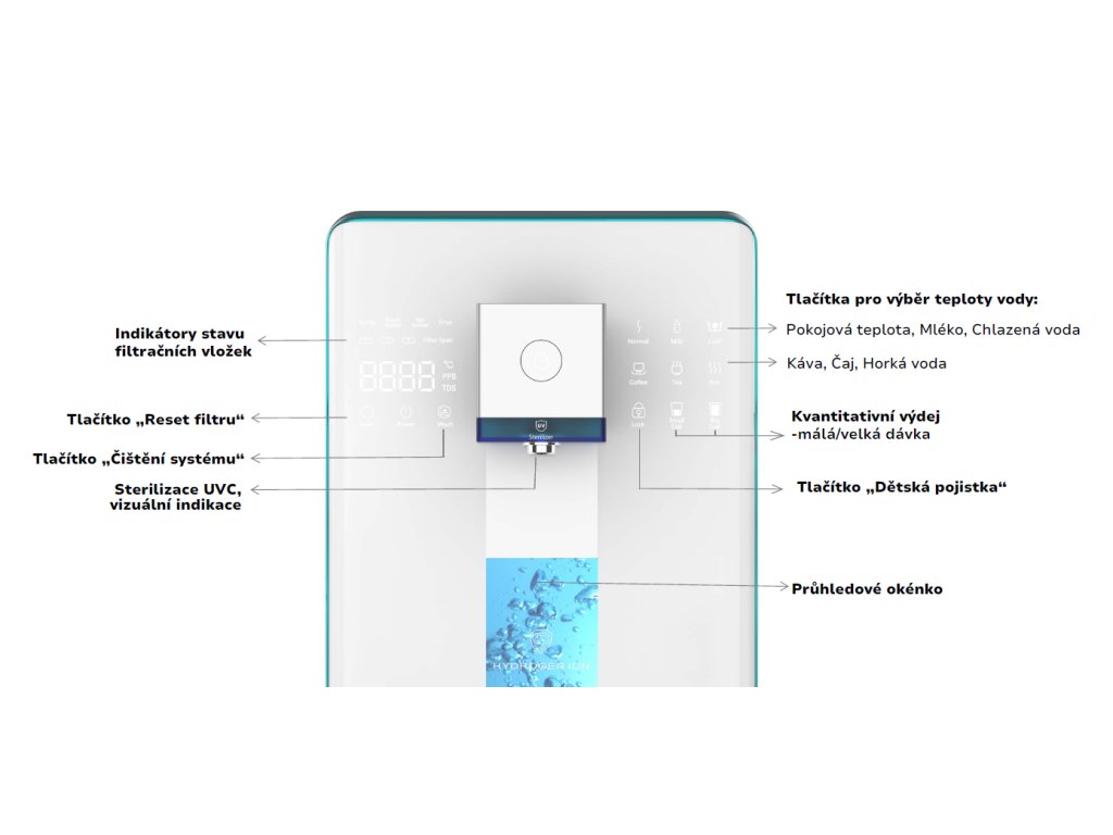 Osim toga, uređaj je opremljen UVC LED sterilizacijskom lampom, koja jamči dodatnu zaštitu od virusa i bakterija. Zahvaljujući preglednom dodirnom upravljačkom panelu s inteligentnim funkcijama rukovanje je jednostavno i intuitivno. Dugme za dječju zaštitu doprinosi sigurnom korištenju uređaja, dok funkcija kvantitativnog doziranja vode osigurava veći korisnički komfor. Integrirani svjetlosni indikator upozorava na potrebu zamjene filtracijskih umetaka.