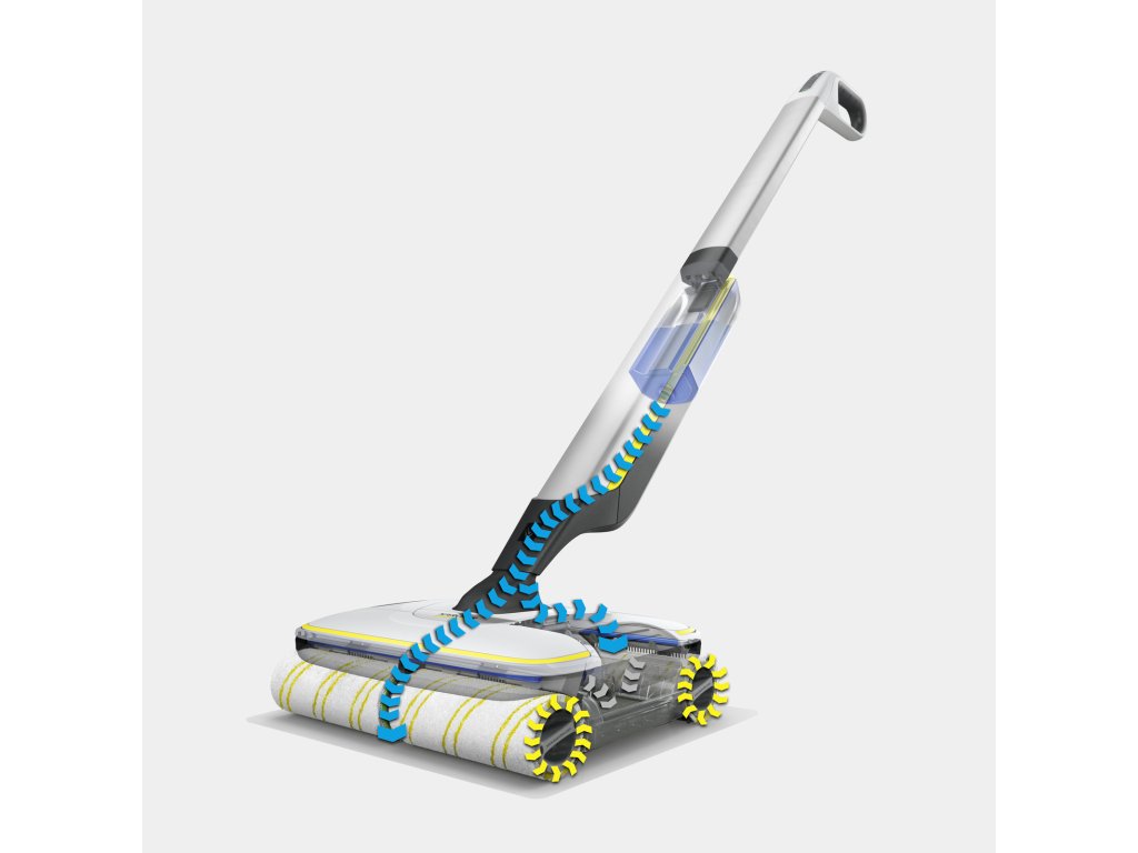 Tehnologija s četiri valjka s kontrarotacijom i filtri za kosu osiguravaju savršeno čiste površine. Zahvaljujući sustavu s dvije posude pranje podova je higijensko, jer uvijek koristi čistu vodu dok se prljavština skuplja u odvojenoj komori.