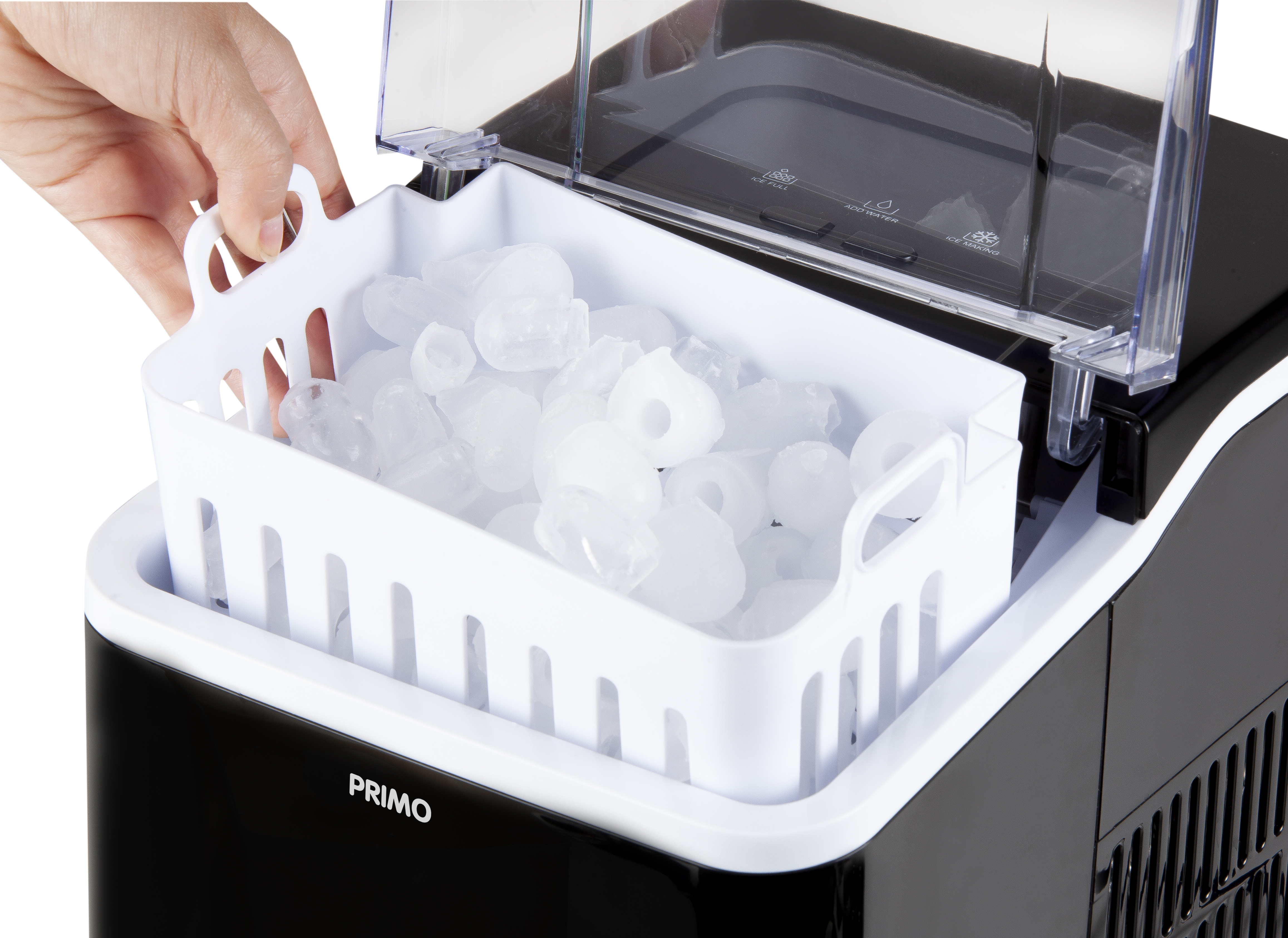 Proizvođač leda PRIMO PR407IB je pouzdan pomoćnik za svakoga tko želi uživati u savršeno rashlađenim napitcima tijekom dana. Ovaj kompaktni uređaj može proizvesti do 12 kg leda u 24 sata, a zahvaljujući velikom spremniku od 1,5 litre idealan je za kućnu upotrebu, zabave ili ljetna roštiljanja. Proizvodnja je brza – svakih 9 minuta pripremi se 9 ovalnih kockica leda.
