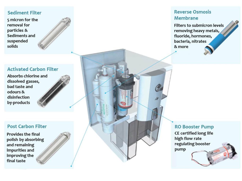 Osnova ove filtracije je RO membrana s porama veličine molekule vode, što je 0,0005 mikrona. Veličina tih pora u membrani jamči zadržavanje svih neželjenih tvari s učinkom više od 95 %. Veće su npr. bakterije, virusi, molekule svih kemijskih elemenata, herbicidi, nitrati i svi teški metali, ostatne tvari iz farmacije (hormonalna kontracepcija, psihotropne tvari itd.), koji se sve češće pojavljuju u pitkoj vodi. Sve to opterećuje naš organizam. Filtrirana voda se naknadno obogaćuje specijalnom remineralizacijom, koja obogaćuje filtriranu vodu potrebnim mineralima (kalcij i magnezij) i povećanom pH vrijednosti vode radi smanjenja zakiseljavanja organizma. Ovaj filtarni sustav možete koristiti gdje god trebate (dom, vikendica, odmor, putovanja, ured).