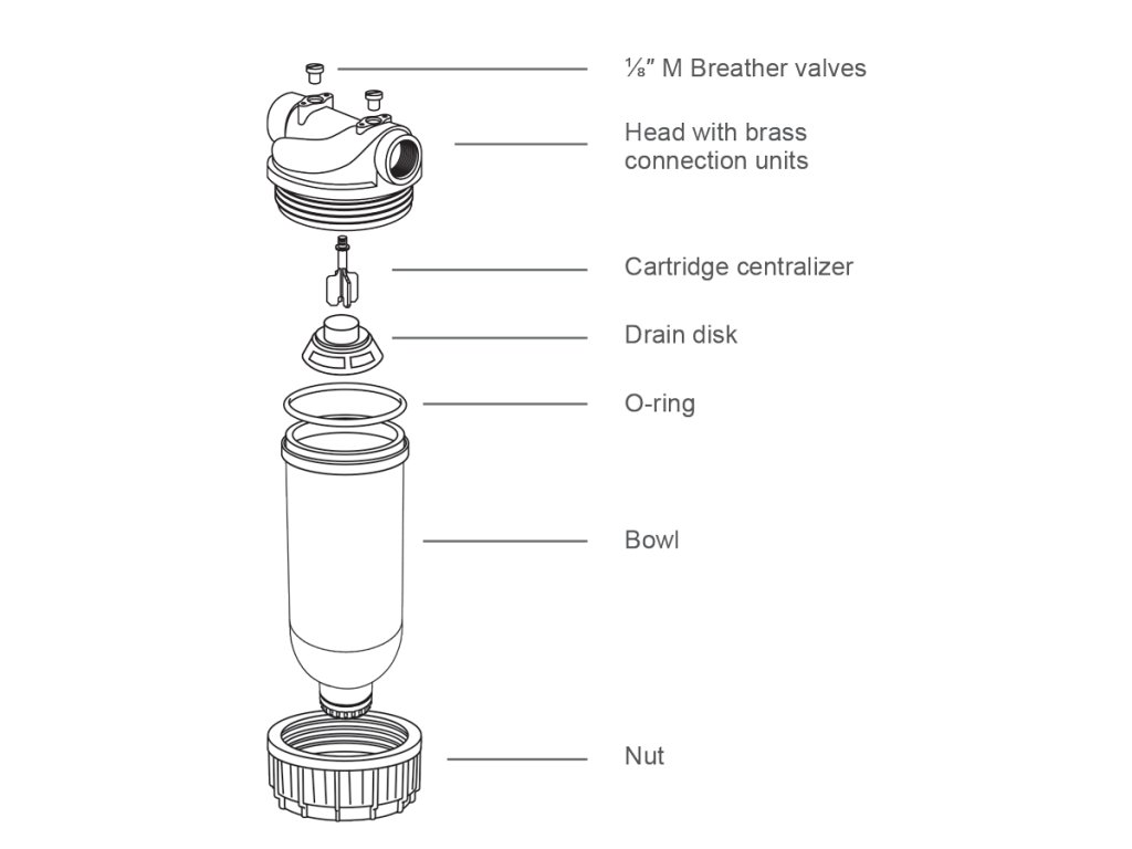 Konstrukcija ovog modela sastoji se od tri glavna dijela (glava-matica-tuba), što osigurava jednostavnu montažu i pouzdan rad. Glava filtera izrađena je od prirodnog mesinga, a tuba od PET-G, što osigurava dugu trajnost i pouzdanost. Opremljena je dva ventila za odzračivanje.