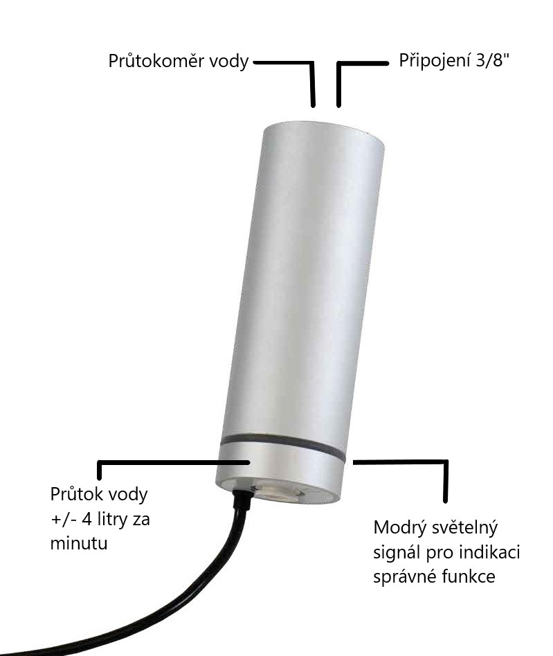 Uređaj je opremljen mjeračem protoka za uključivanje UV lampe i plavom svjetlosnom indikacijom za signalizaciju ispravnog rada.