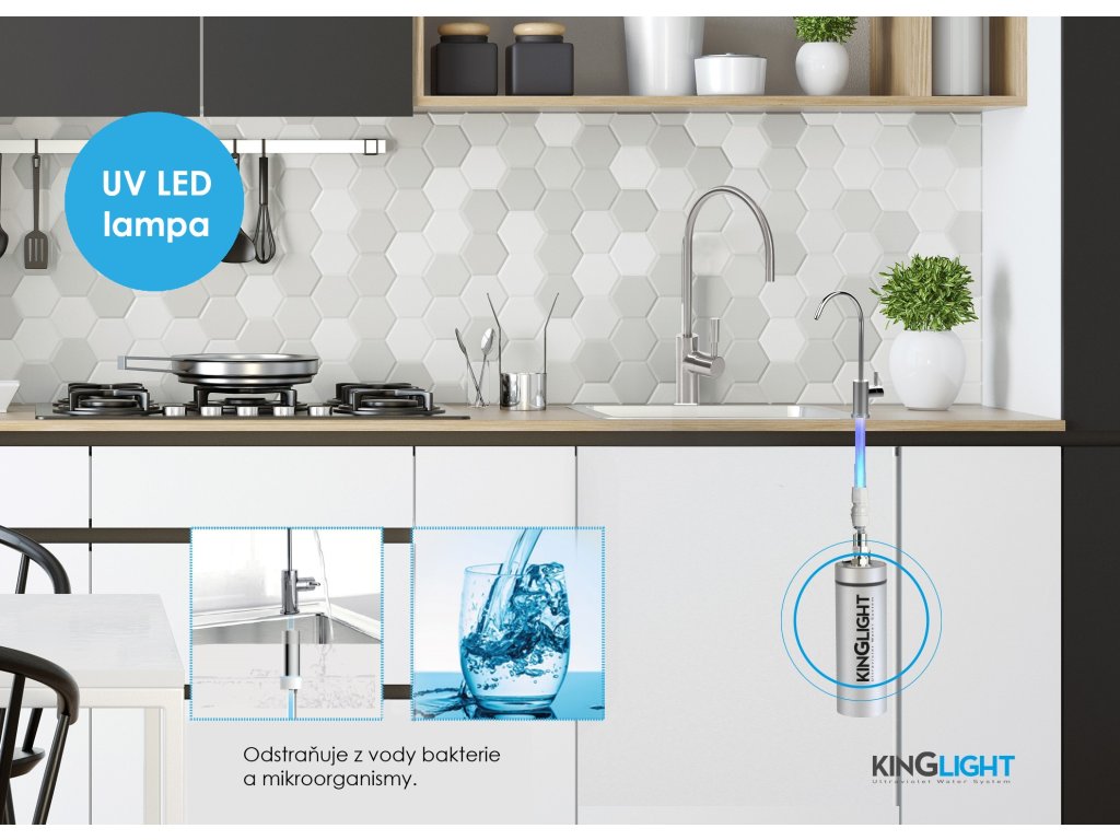 Mala UV LED lampa King 4L je uređaj namijenjen uništavanju bakterija, cisti i virusa iz vode s učinkovitošću do 99,9 %. UV lampa se priključuje izravno na izlazni ventil vodne filtracije ili dozatora prije brzog spoja 3/8" (3,5 mm plastična cijev). Ova metoda dezinfekcije nalazi primjenu u obiteljskim kućama, vikendicama, laboratorijima, restoranima i bolnicama.