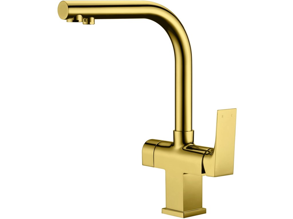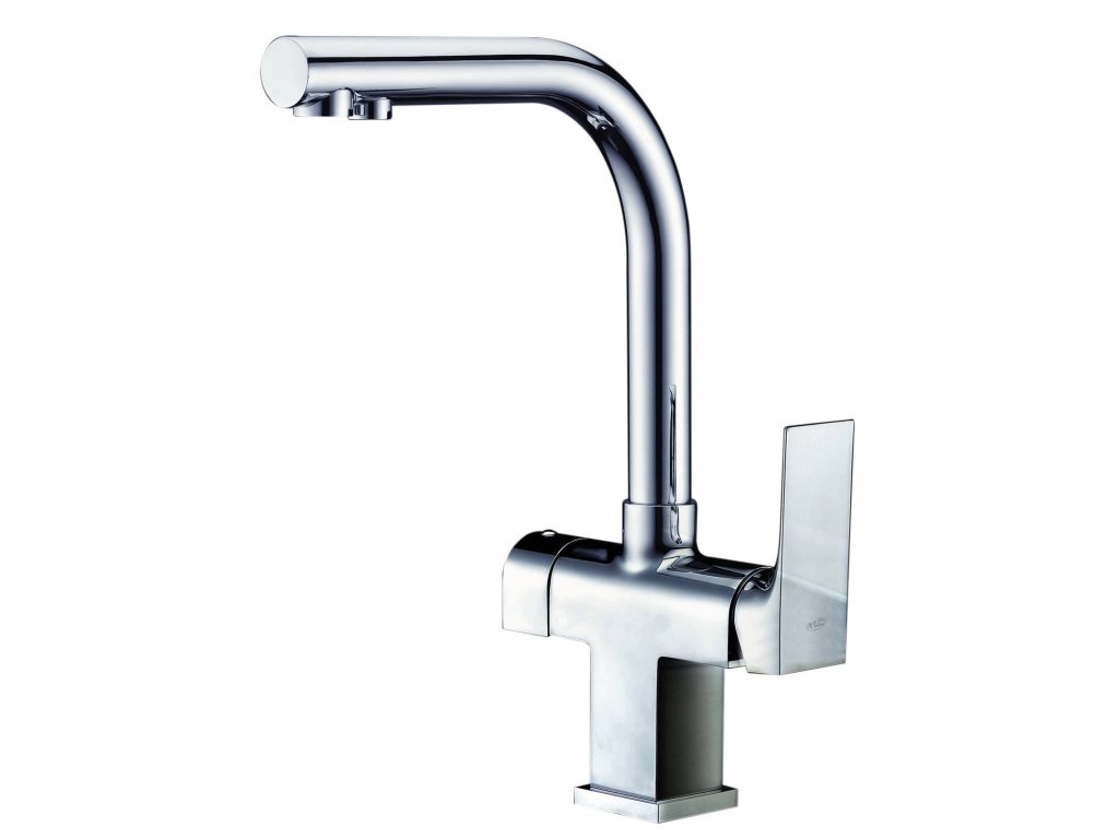Vodovodna trostruka baterija za filtriranu i vodovodnu (toplu i hladnu) vodu. Sustav filtrirane vode nalazi se u jednom izlazu, gdje je odvojen od tople i hladne vode sa svojim vlastitim izlazom vode. U bateriji su ugrađena dva keramička kartuša i perlator koji osigurava uštedu vode. U paketu su također komponente za priključak.
