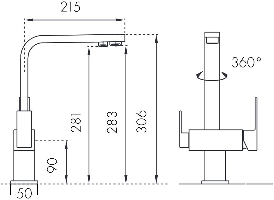 Vodovodna trostruka baterija za filtriranu i slavinsku (toplu i hladnu) vodu. Sustav filtrirane vode nalazi se u jednom kraku, gdje je odvojen od tople i hladne vode vlastitim izljevom vode. U bateriji su ugrađene dvije keramičke kartuše i perlator koji osigurava uštedu vode. U paketu se nalaze i komponente za priključak.