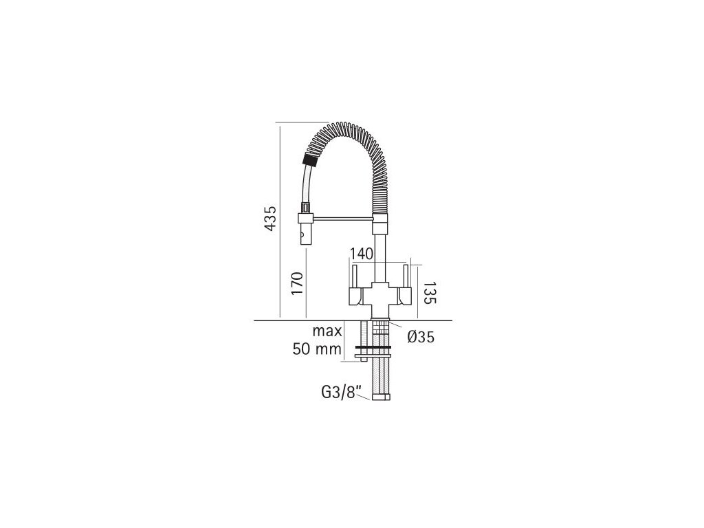 Vodovodna i filtrirana voda prolaze istim krakom. Ova trosmjerna miješalica nema odvojenu vodovodnu cijev za filtriranu vodu, pa nije pogodna za bunarsku ili bakteriološki sumnjivu vodu. Dio crijeva prolazi kroz oprugu radi lakšeg rukovanja prilikom pranja posuđa i zahvaljujući opružnom sustavu možete slobodno rukovati miješalicom.